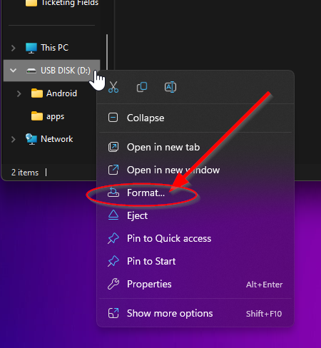 - Click on the "Format" option and Windows will start the formatting wizard