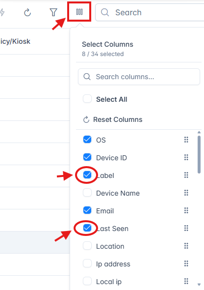 - In the management portal under Device view, click the Columns icon located in the top right corner. Pictured in the image below