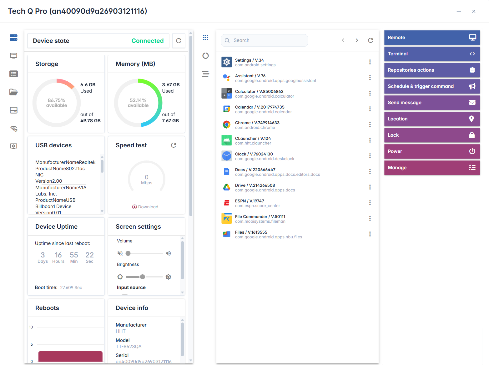 General - Basic information about the panel such as device uptime, wifi signal, storage, tags, etc.