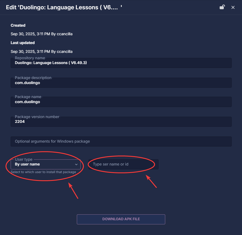 - Select the pencil icon on a previously made APK package, or create a new one.